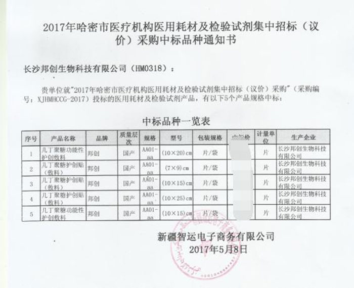 恭賀我公司產(chǎn)品在2017年新疆哈密醫用耗材招標采購項目中標