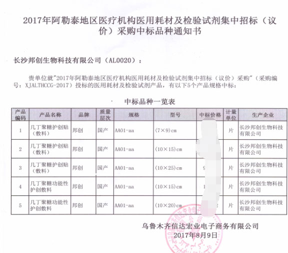 恭賀我公司產(chǎn)品在2017年新疆阿勒泰醫用耗材招標采購項目中標